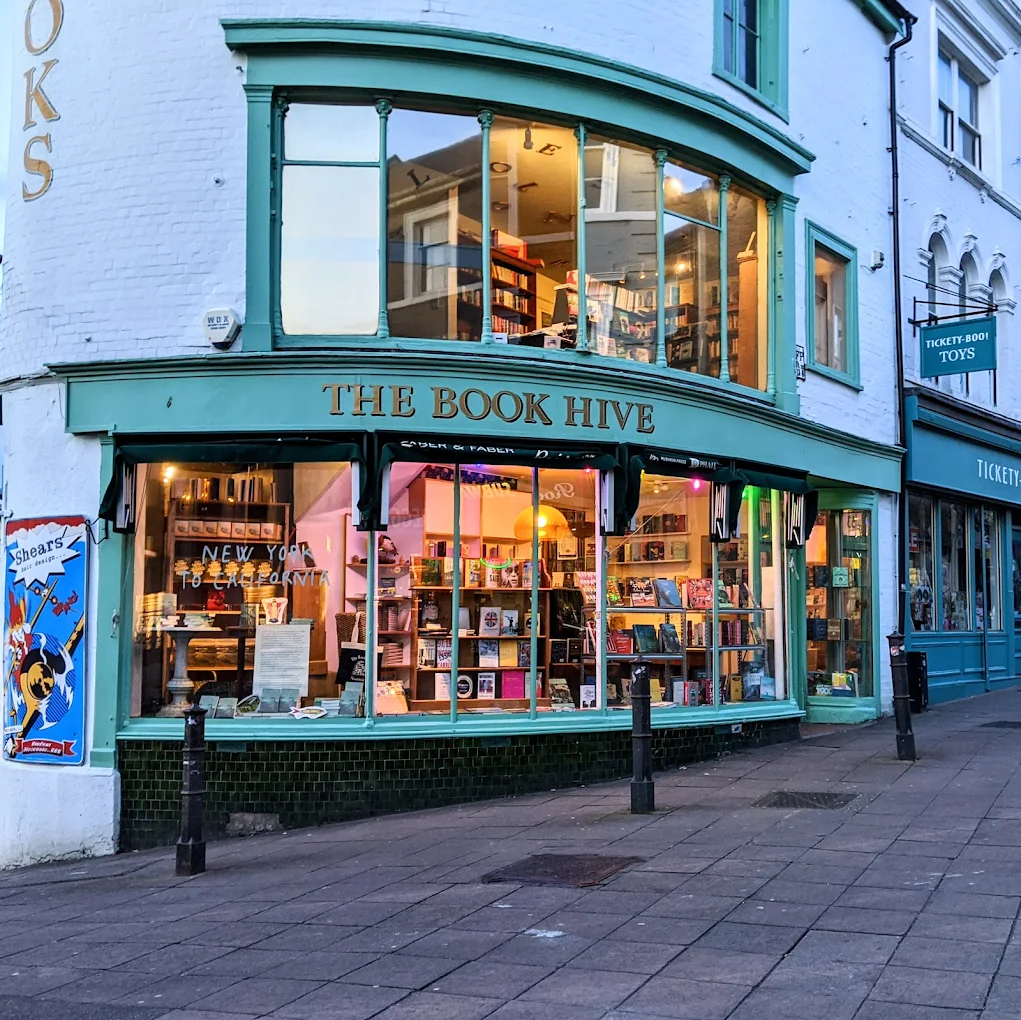 With a curved storefront painted a lively green, the Book Hive is an award‑winning independent bookshop in central Norwich known for its unique selection of books. The Hive proudly embraces the offbeat, curating a distinctive selection that ranges from gothic fiction to military-focused topics.