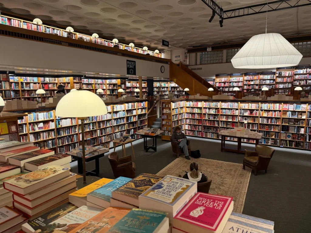 The shelves are filled with a discerning mix of new fiction, history, biography, and poetry, plus a strong children’s section and Daunt’s signature travel‑focused, country‑by‑country layout. The shop also advertises regular cultural events, notably book discussions and author talks, tickets for which can be purchased on the website.